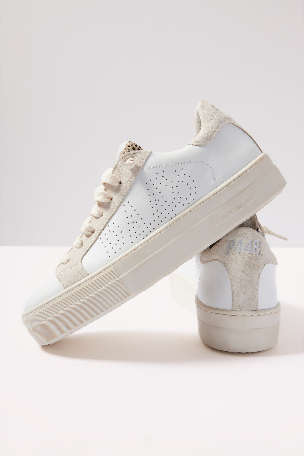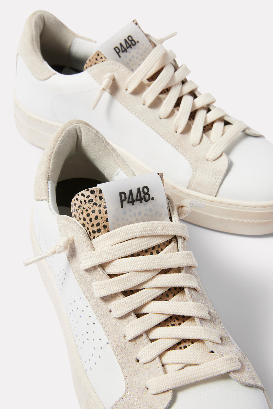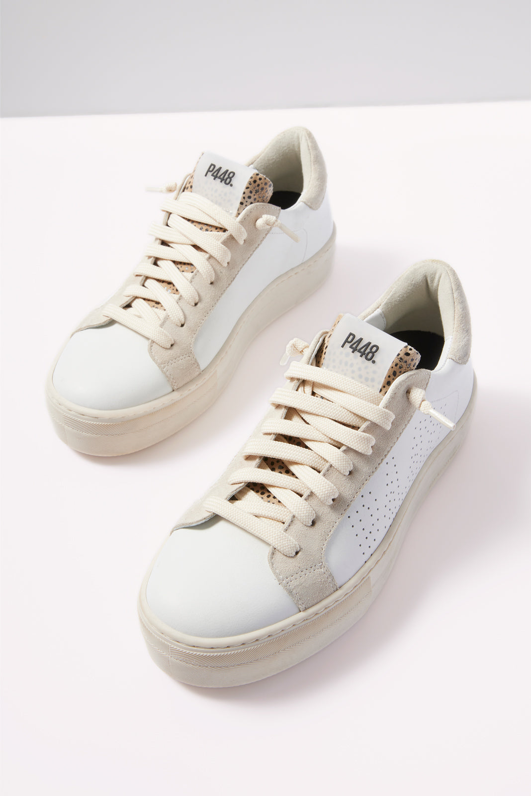 Aleopard tongue and textured heel tab elevate these stylish platform sneakers by P448, featuring a leather upper with a perforated logo detail.