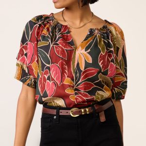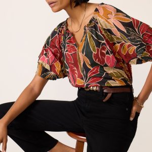 Crafted in a gorgeous printed voile, the Thersa Blouse by Velvet features a smocked split neckline, short sleeves with ruffle details, and a relaxed, cropped silhouette.