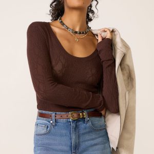 A flattering scoop neckline updates this must-have mesh top by Z Supply. The Tibi semi-sheer top features a fitted silhouette with long sleeves and delicate floral details.