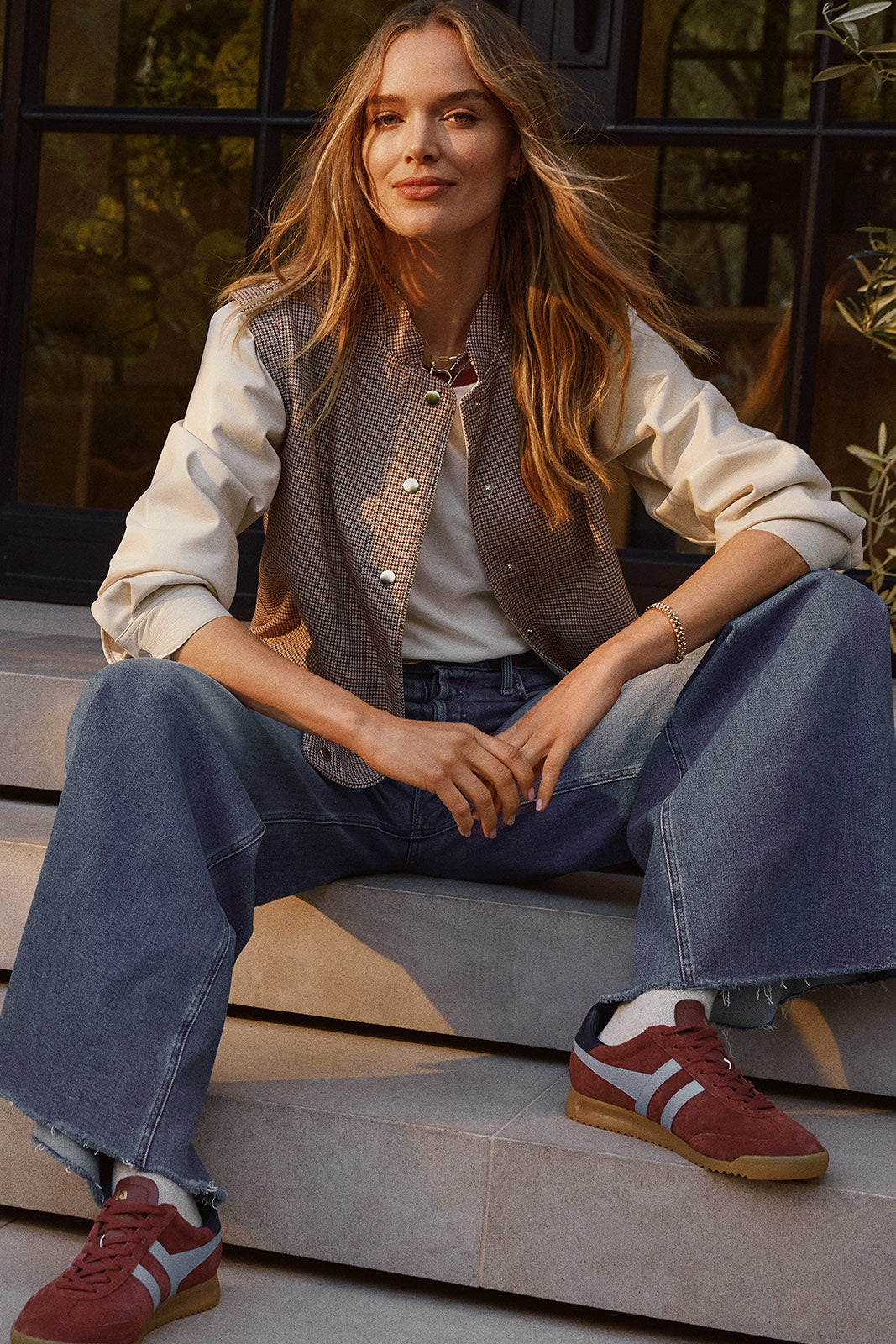 Make a statement with these sportymaroon and blue sneakers by Gola, featuring an ’80s-inspired silhouette with a suede upper and gum sole.