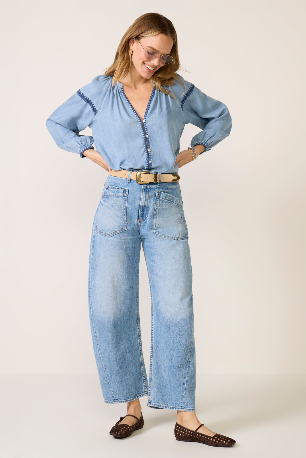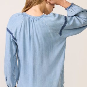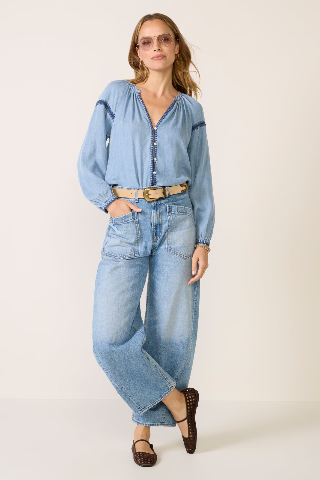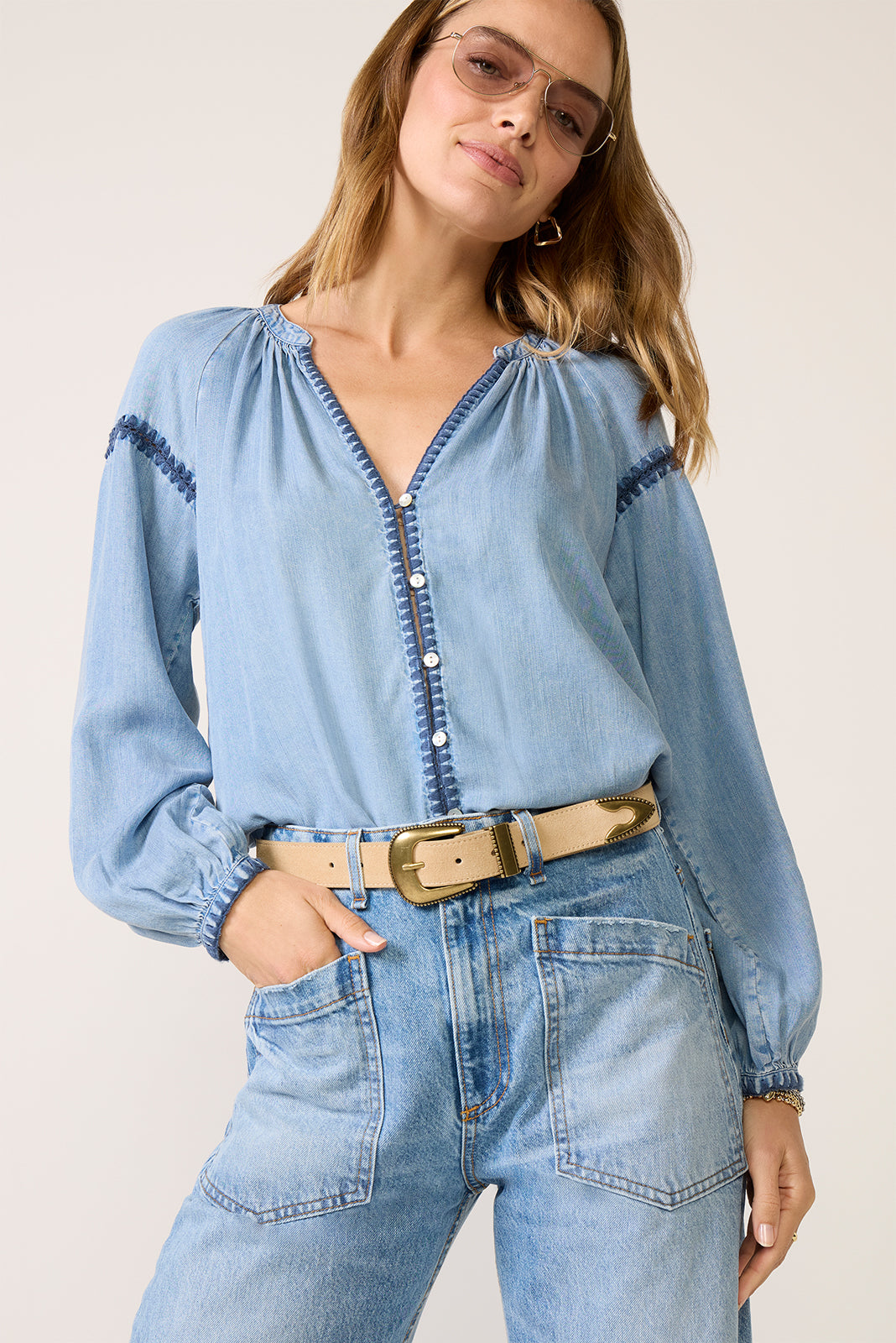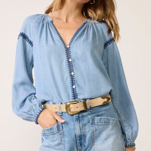 Soft lyocell denim and whipstitch detailing come together in this stylish Rails top, featuring a relaxed silhouette, front button closures, and long sleeves.