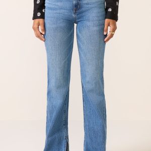 Crafted in comfortable stretch denim, this bootcut jean by EVEREVE features a mid-rise silhouette with a 34″ inseam, versatile blue wash, and slit hems.