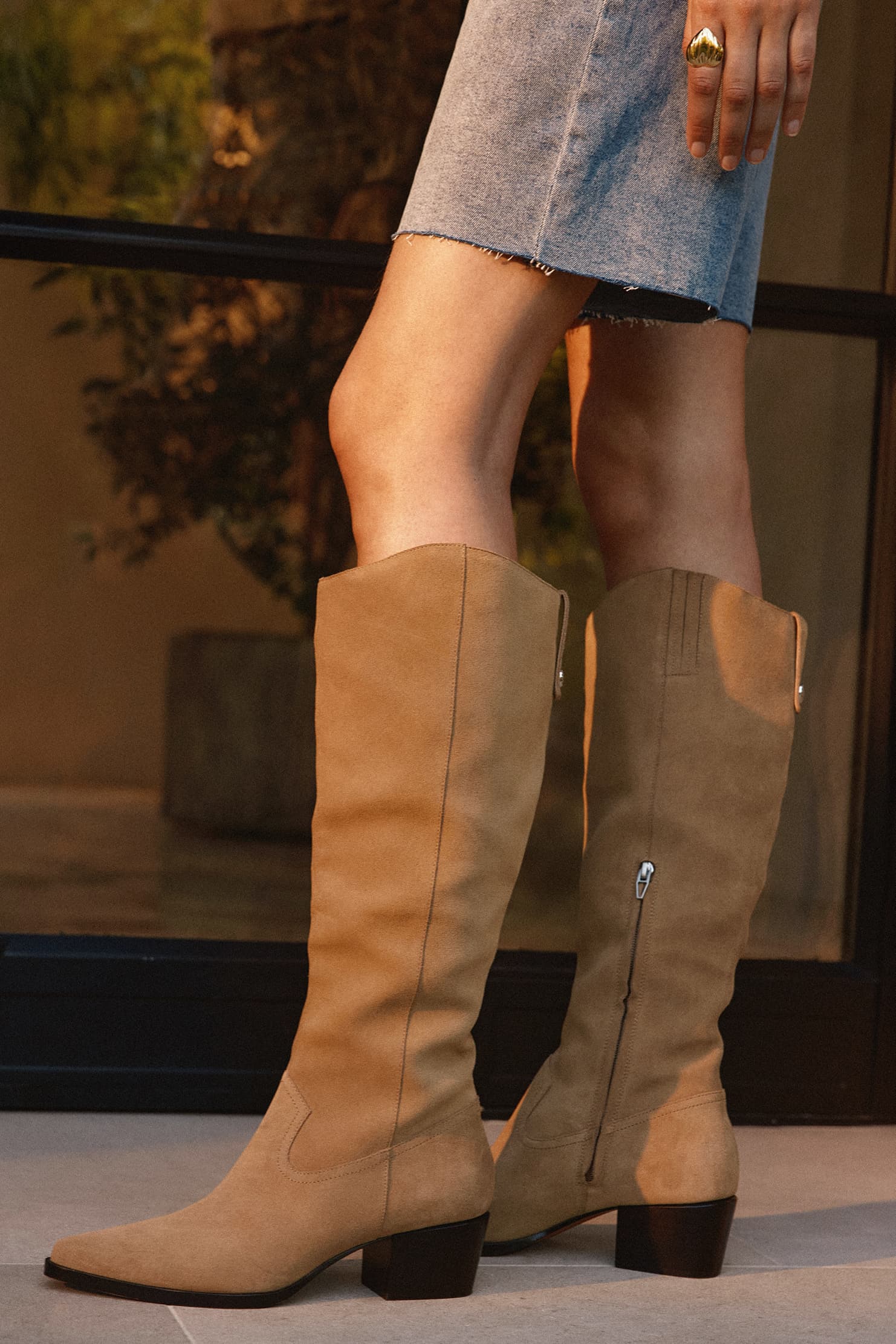 Finished in soft suede, the Virona knee-high boots by Dolce Vita feature a pointed toe, inside zipper closure, and contrasting block heel.