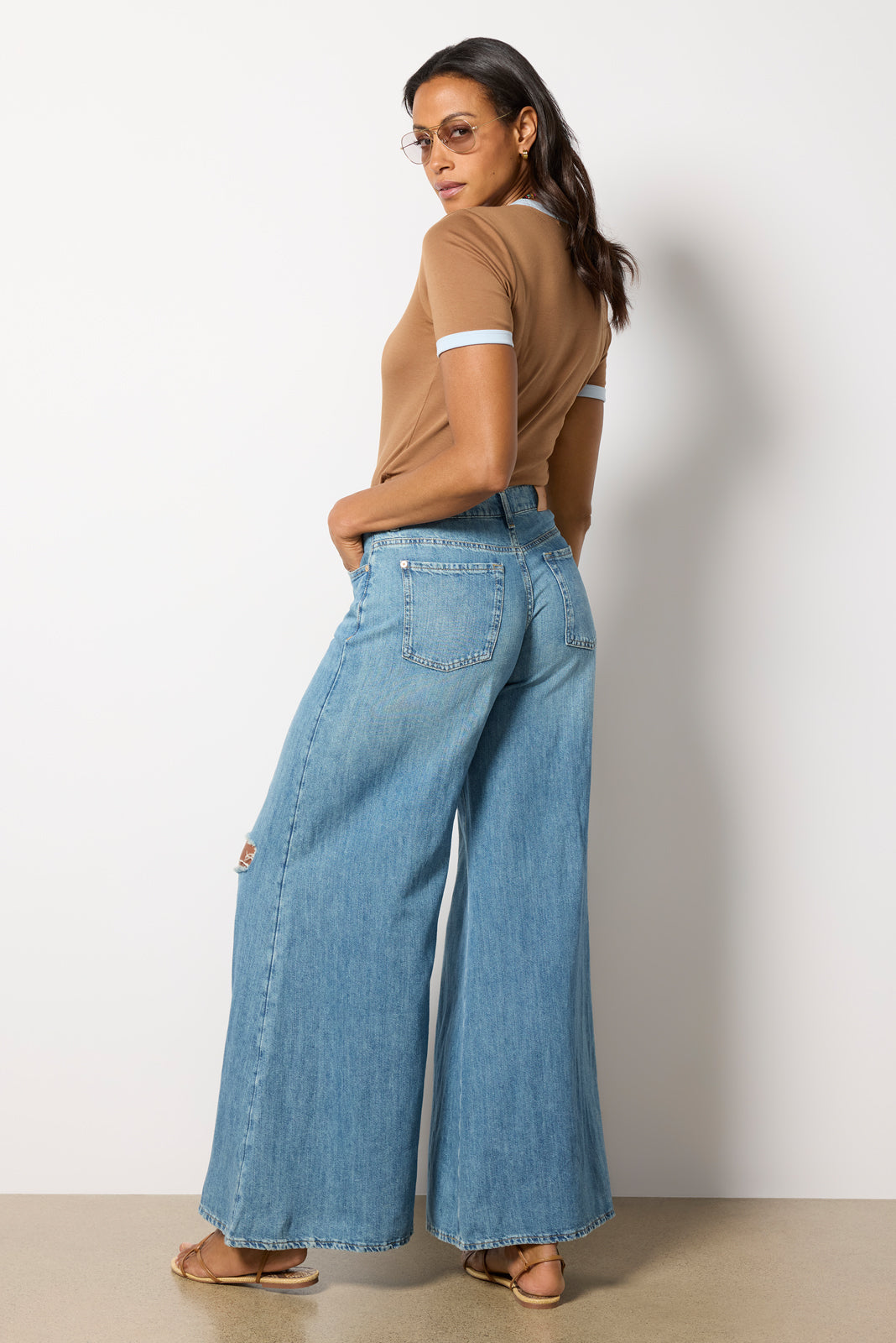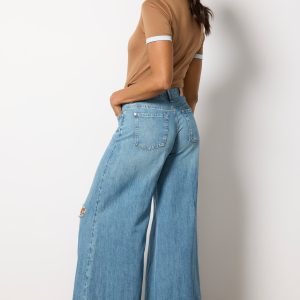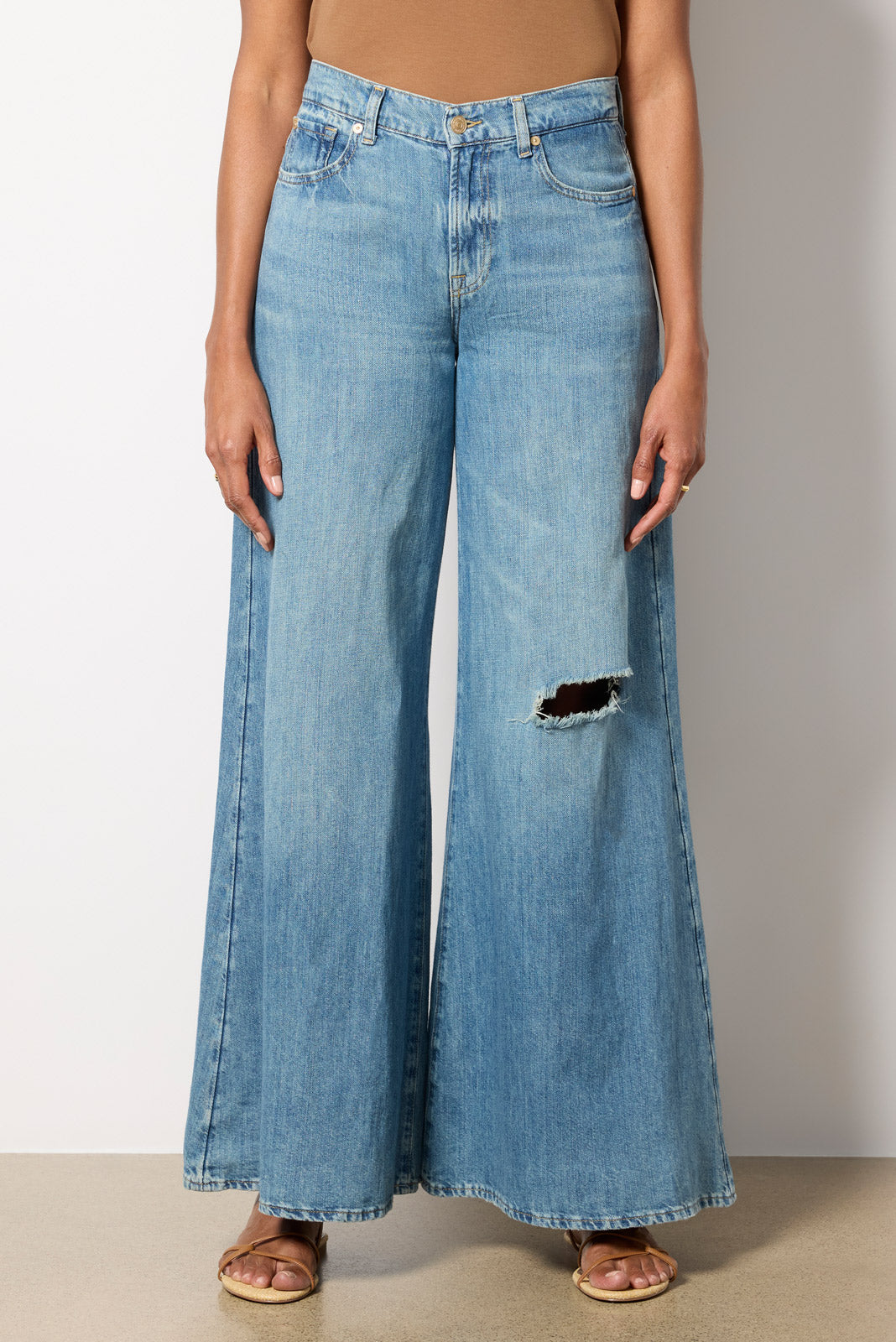 An exaggerated wide-leg silhouette defines the Willowjean by 7 For All Mankind. Finishedin soft, super lightweight linen denim, these wide leg jeans featurea mid-rise waist, full-length inseam, and destruction at the knee.