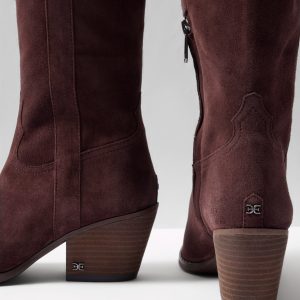 A Western-inspired design defines these stylish knee-high boots by Sam Edelman, crafted in soft vegan suede with a pointed toe and angled block heel.