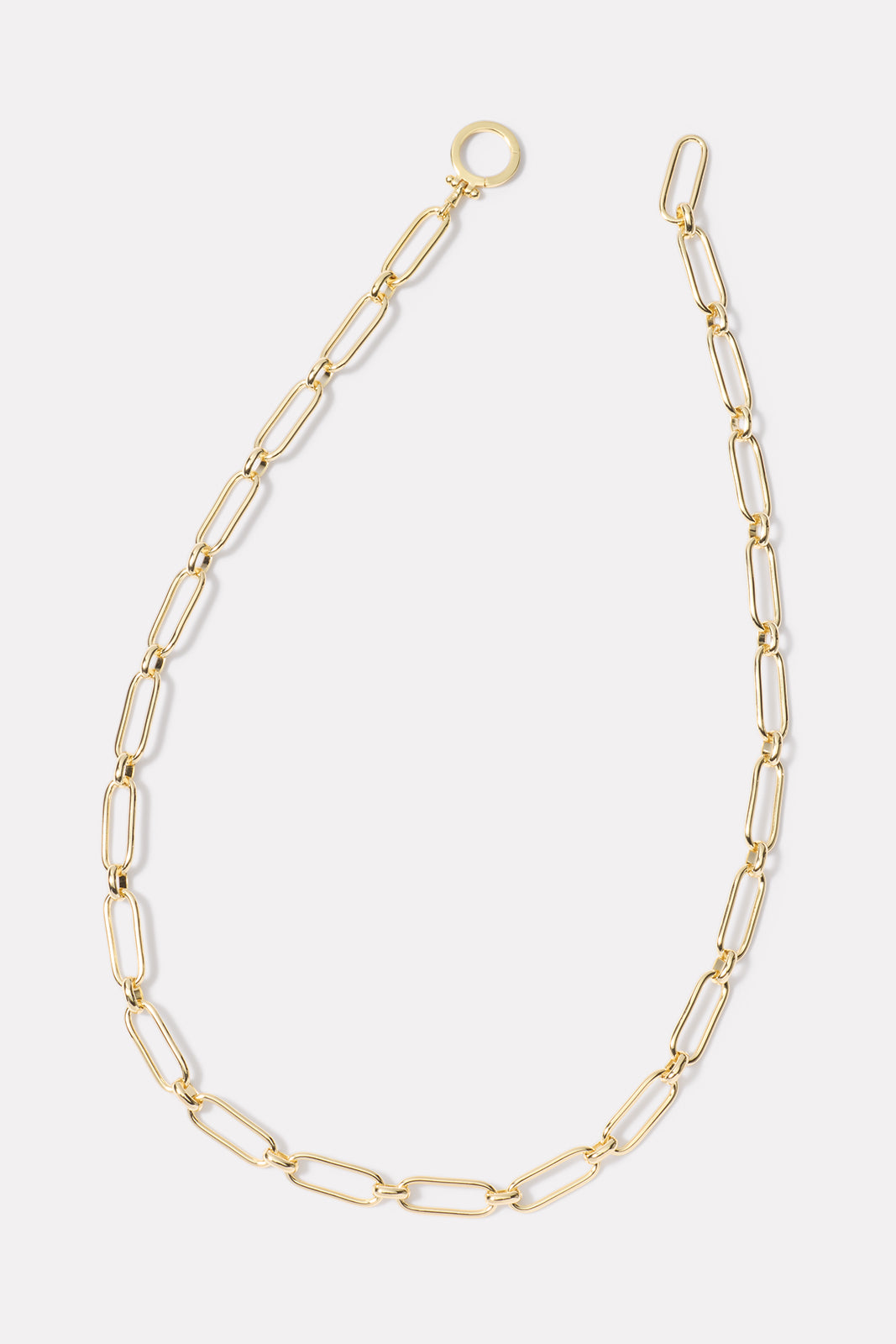 Designed to be worn with or without charms, the Zoey Statement Necklace by Gorjana features an 18K gold-plated open link design and a hinged closure.